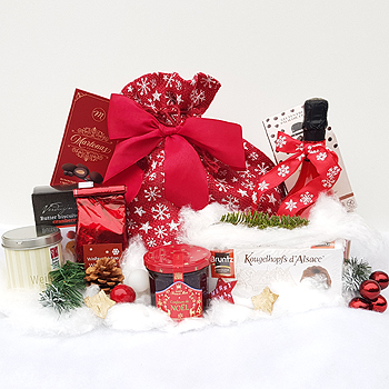 Gift Icy Star Pretty jute pouch with icy star design filled with wonderful delicacies that make the Christmas season even more beautiful: Prosecco in a red decorative bottle Heavenly French Christmas jam H. Sachers white hot chocolate Christmas tea with almonds and rose blossoms Cranberry cookies Chocolate Cookies Alsatian chocolate truffles Chocolate-covered nuts.